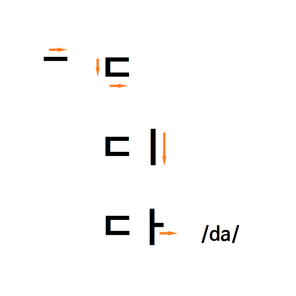The third consonant 'ㄷ' sounds like 'd' and the first vowels 'ㅏ' sounds like 'a'. Two letters be combined to become '다' sounds like 'da'.